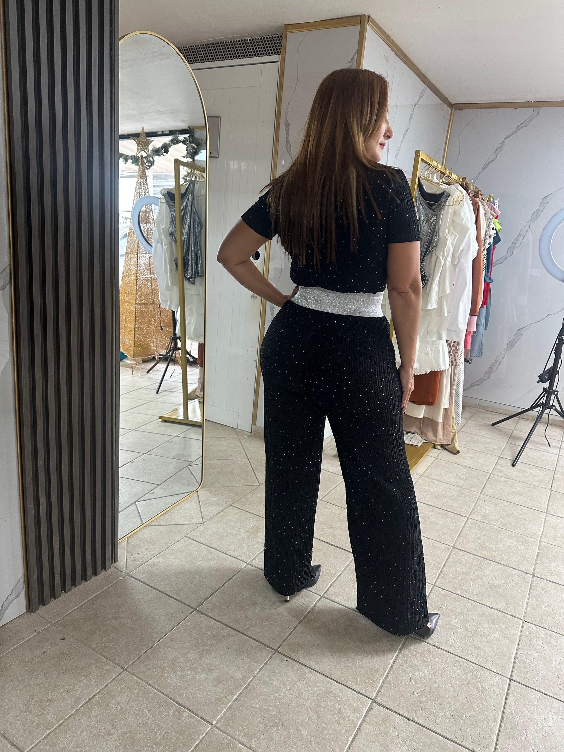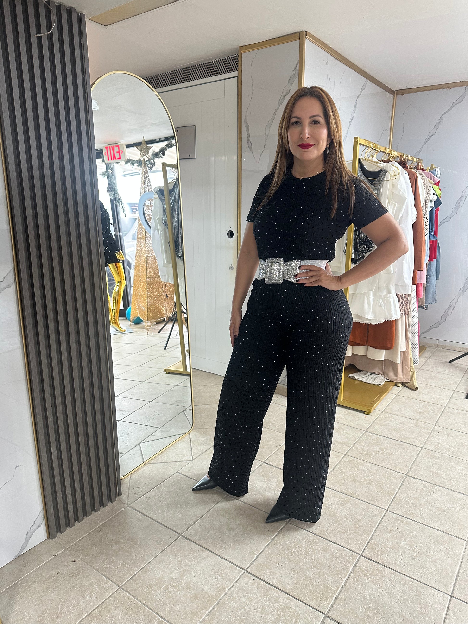Energize your wardrobe with this black spandex set featuring rhinestone details. The waistband is elastic for a comfortable and flattering fit.