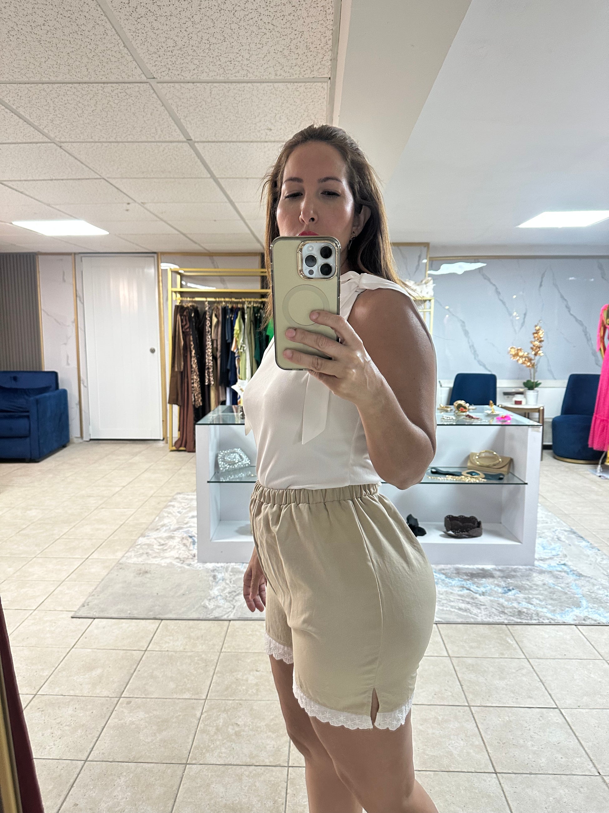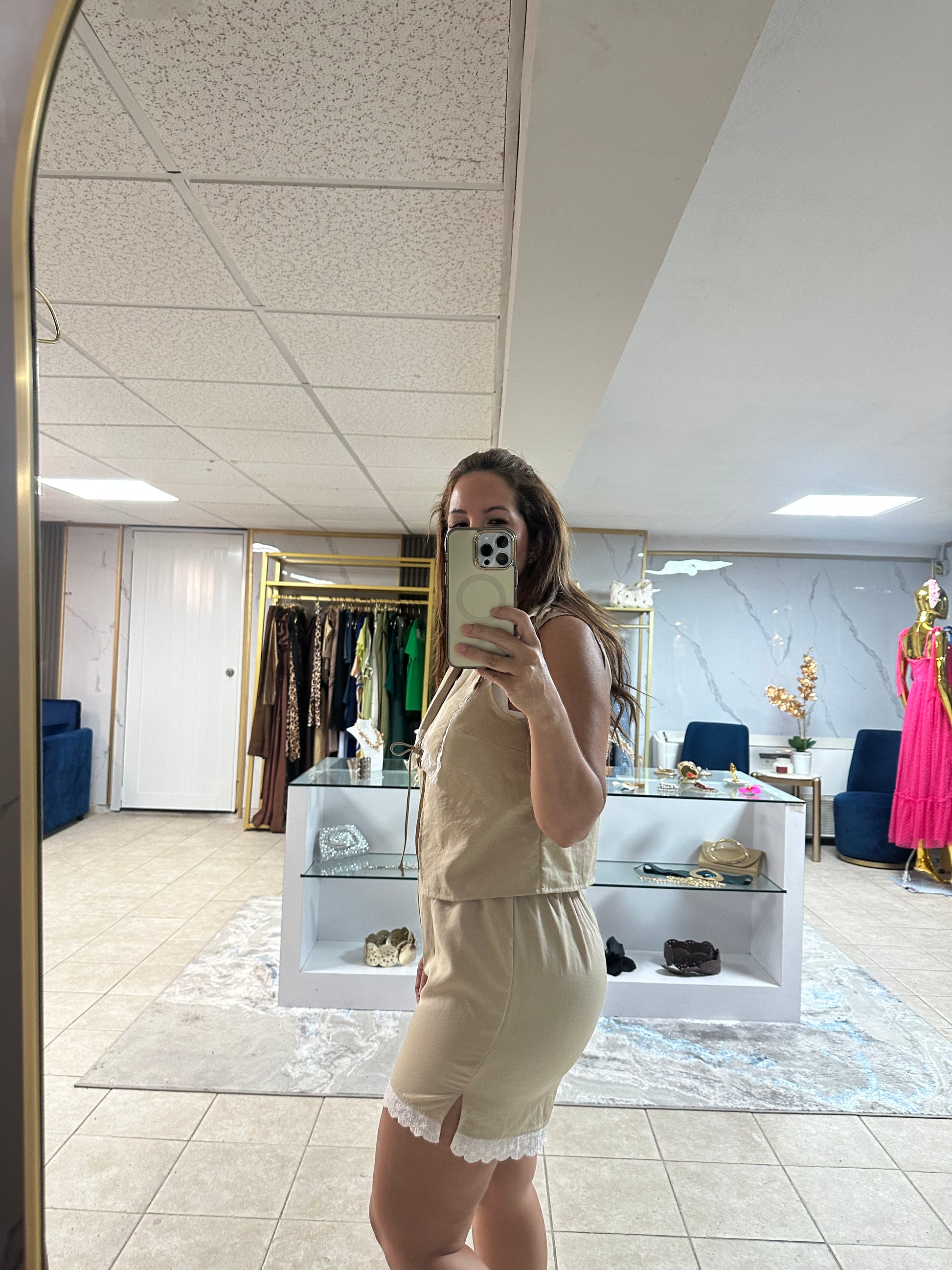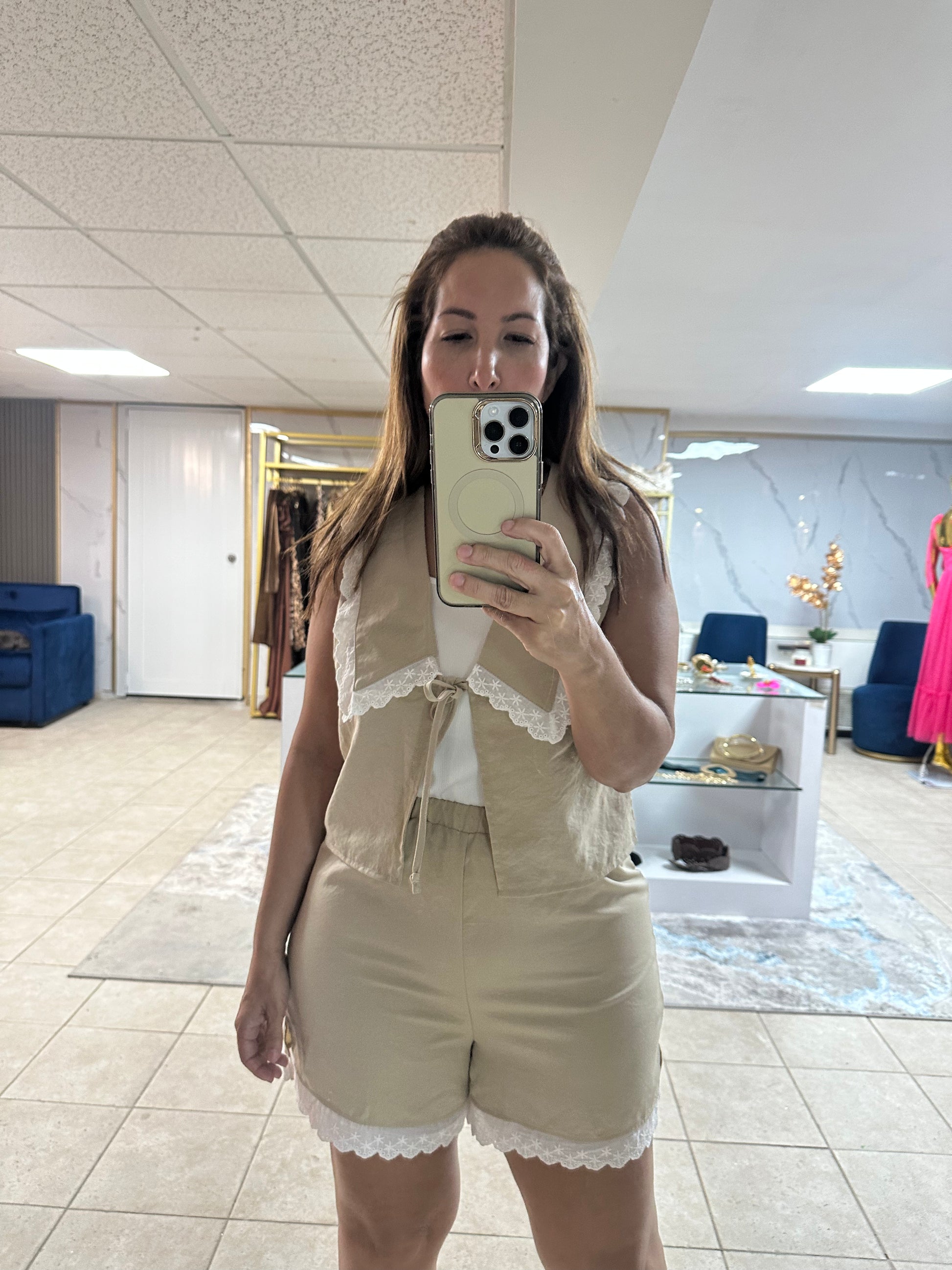 Two-piece set crafted in a soft natural beige tone, perfect for a fresh, feminine, and sophisticated look. It features a sleeveless vest with delicate white lace trim and an adjustable front tie, paired with elastic-waist shorts finished with lace detailing for a romantic and elegant touch.