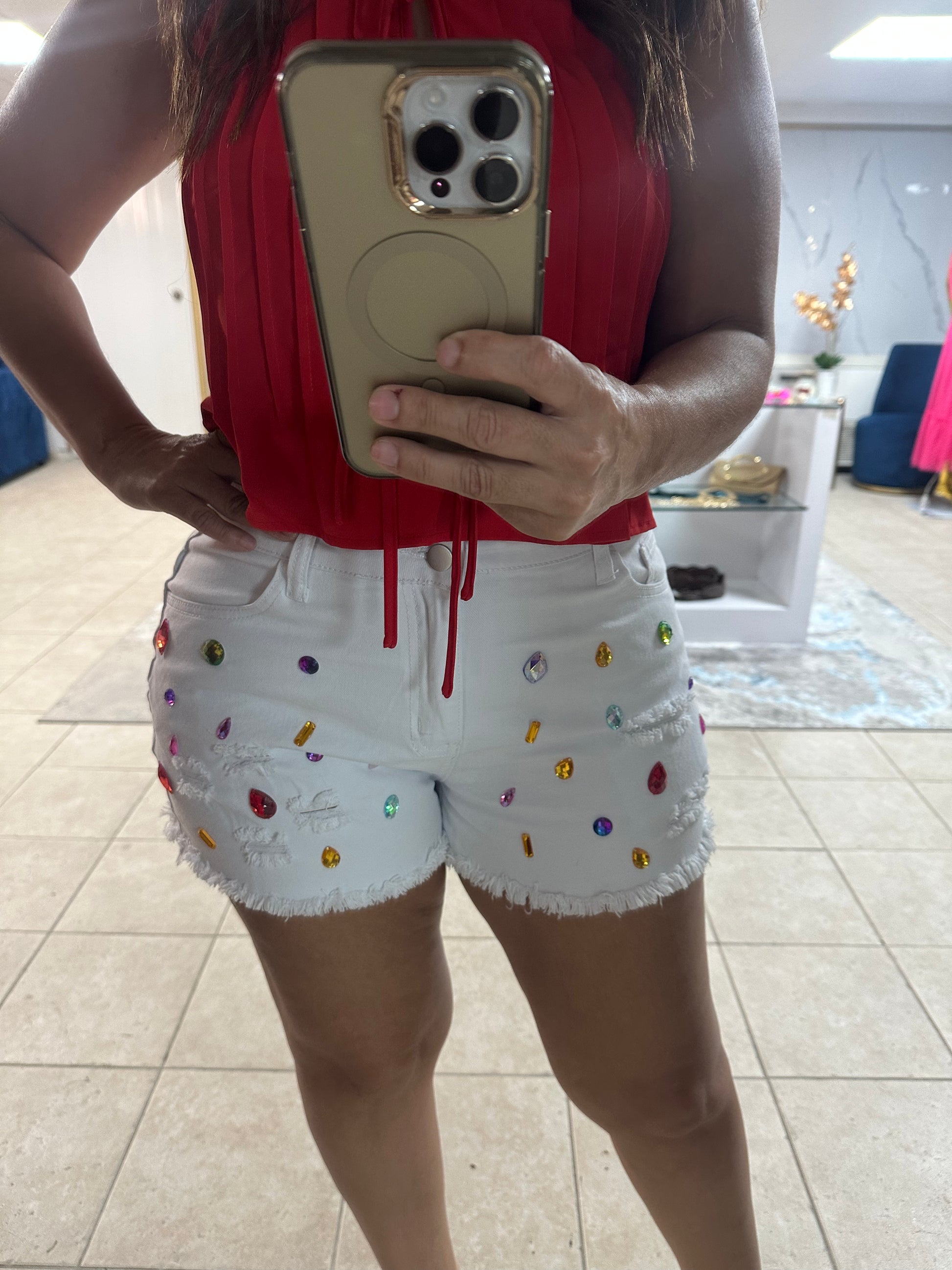 Elevate your style with our Women’s Denim White Shorts from Azure Boutique! Crafted from a blend of 70% polyester and 20% spandex, these distressed, ripped jewel jeans offer both comfort and a chic, edgy look. Perfect for sunny days, they’re designed to inspire confidence and showcase your unique flair